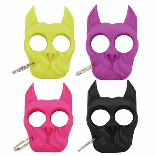 Brutus is the only public safety bulldog keychain accessory that can be attached to keys or easily stowed away. Made of impact resistant ABS plastic, this keychain accessory is so strong it will give you the power of steel wrapped in a defenseless looking dog-shaped keychain accessory. Guard yourself against unwanted advances: put your fingers through the eyes of Brutus and watch the tips of his ears transform into pointed jabbers that will keep any attacker at bay. Available in several different colors. You can protect yourself in black, pink, purple, and neon yellow. Make Brutus your own personal guard dog today!